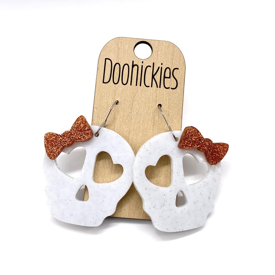 1.5" Glittery Skull with Orange Glitter Bows Acrylic Dangles - Halloween Earrings