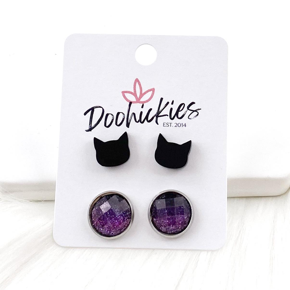 12mm Solid Black Cat Head & Iridescent Purple in Stainless Steel Settings - Halloween Earrings