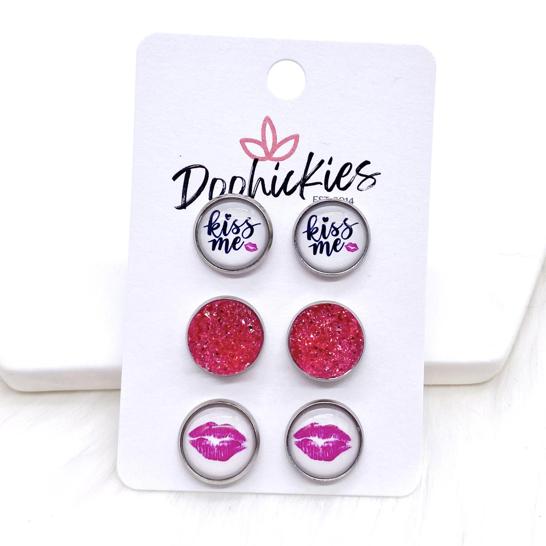 12mm Kiss Me/Hot Pink Sparkles/Hot Pink Lips in Stainless Steel Settings -Earrings