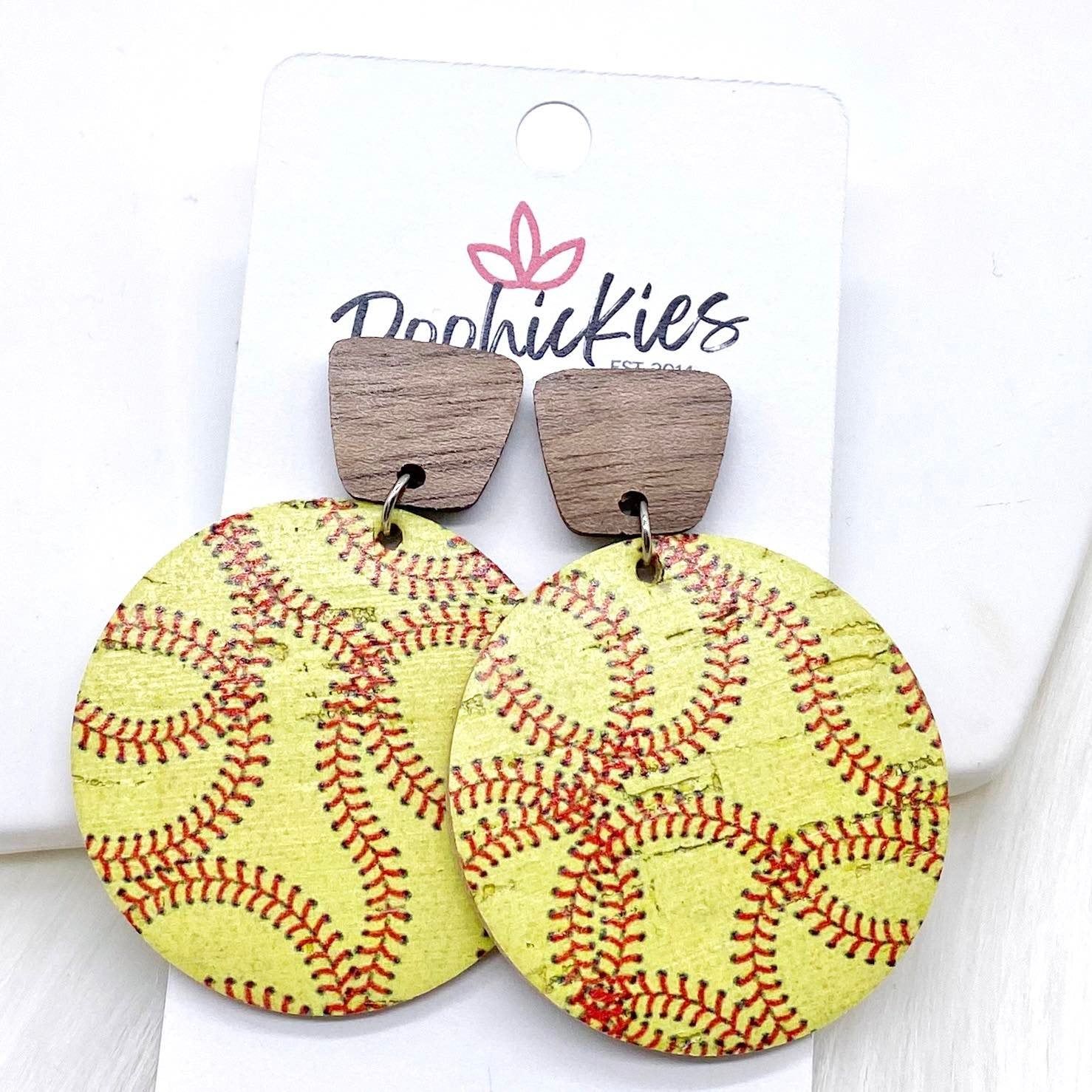 2" Walnut & Baseball/Softball Piggyback Corkies -Sports Earrings