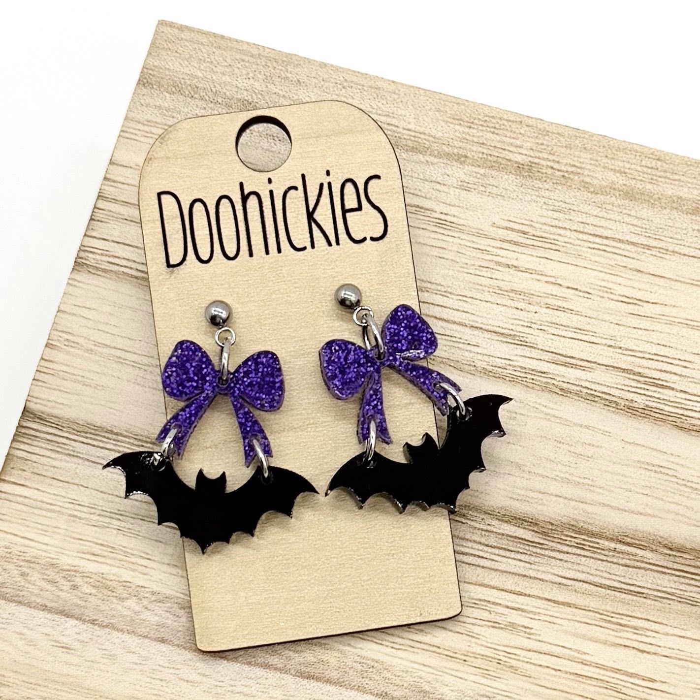 Add a spooky twist to your look with these Bow Bat Dangle Halloween Earrings. Featuring a sparkling purple glitter bow paired with a sleek black bat, they bring playful charm to any Halloween outfit. Lightweight and eye-catching, these earrings are perfect for festive fun and making a statement at any seasonal party.