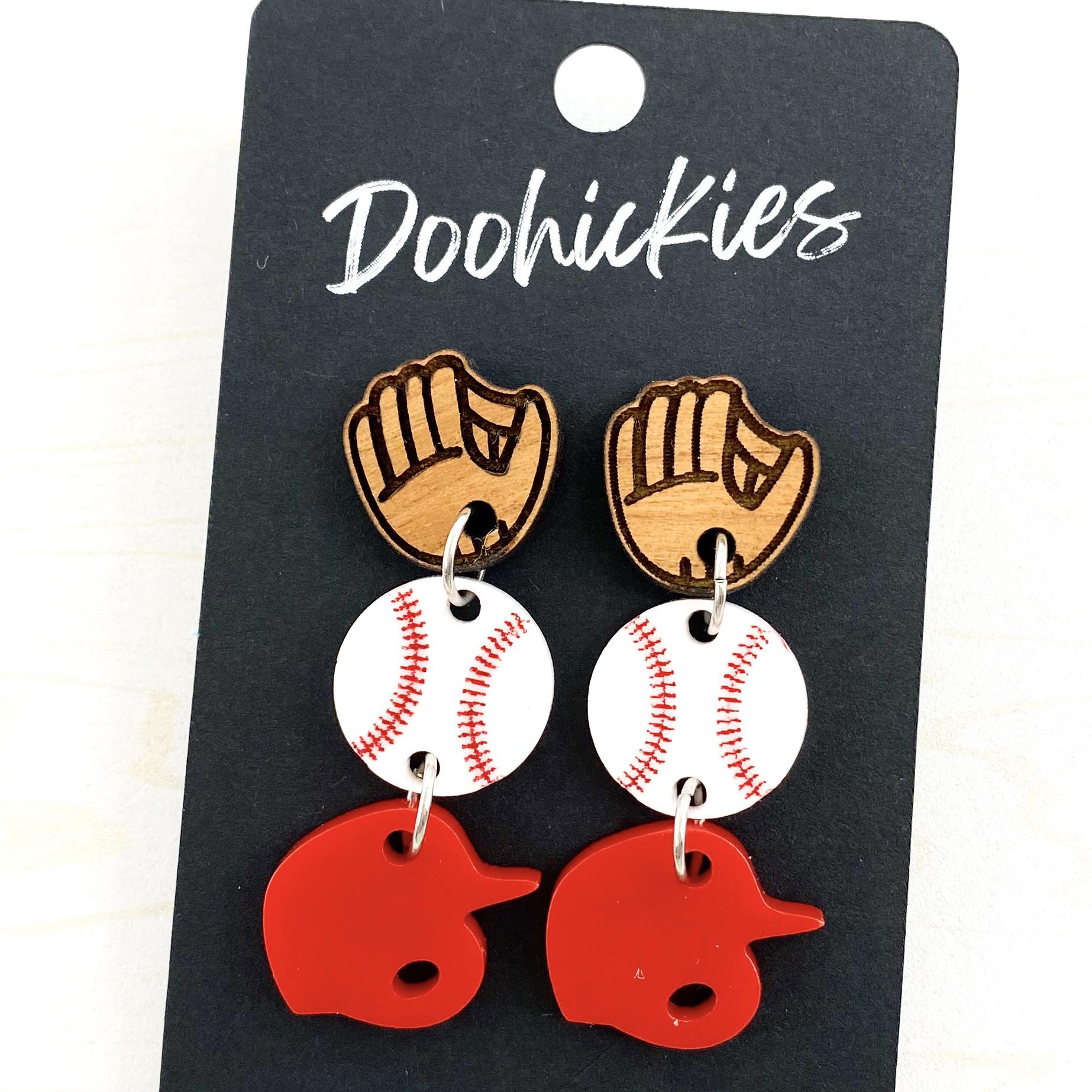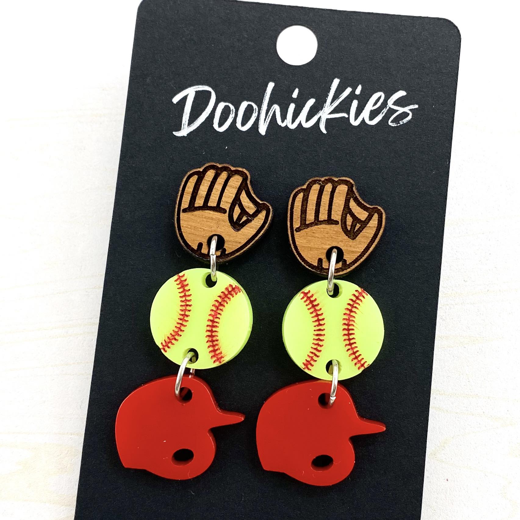 "Hit a home run with our 2" Custom Play Ball Trio! This trio features hand-painted and assembled baseball and softball gear, including sports earrings made of acrylic and wood. Choose from a variety of customizable colors to show off your unique style on and off the field. Swing into action with this must-have accessory!"